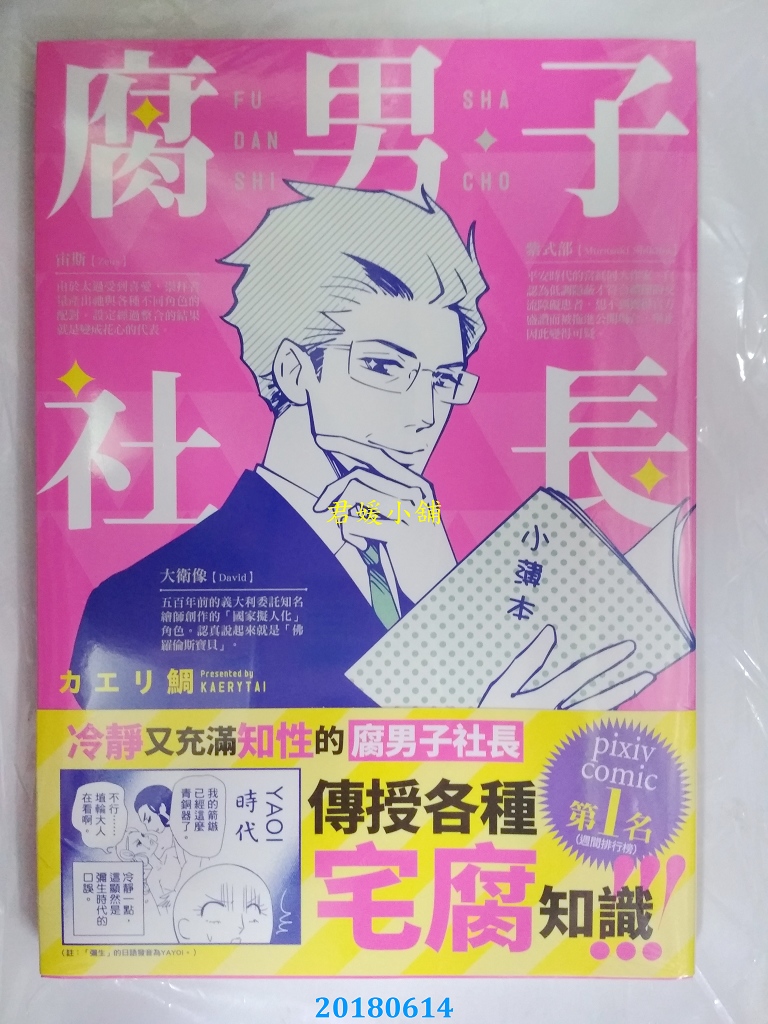 本店刊登的圖片都是第一時間出版日當天所拍,讀者若要首刷書,請在出刊時就來購買!!日久或售完就無庫存,要請書商補書,書商沒有幫忙挑首刷書這樣的服務,都是按書名送來,故不保證有首刷!!除非商品標題有特別寫是首刷版,請不要以非首刷或與圖片不同,來退貨退款,恕不受理!!購買前請張大眼睛看清楚,或旺旺詢問客服,以避免日後糾紛!!謝謝!! 【內容簡介】 腐男子社長(全) 書重 310 公克