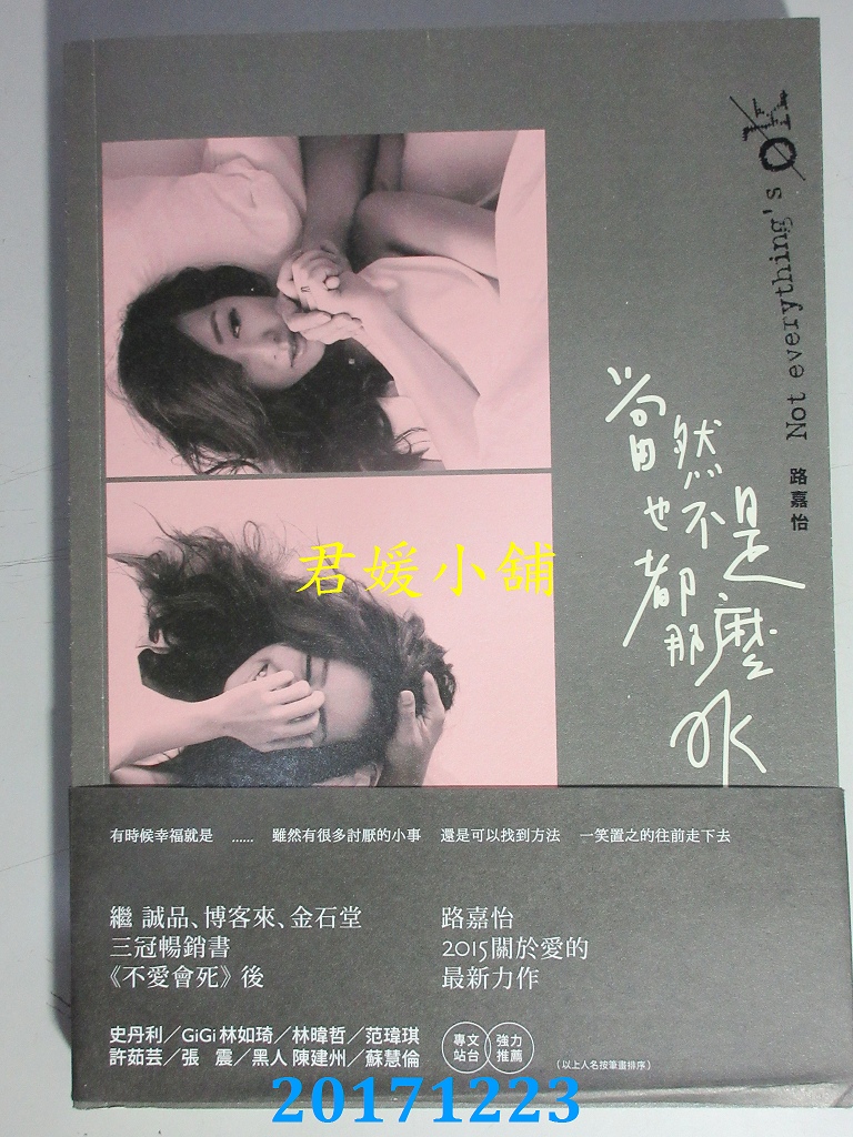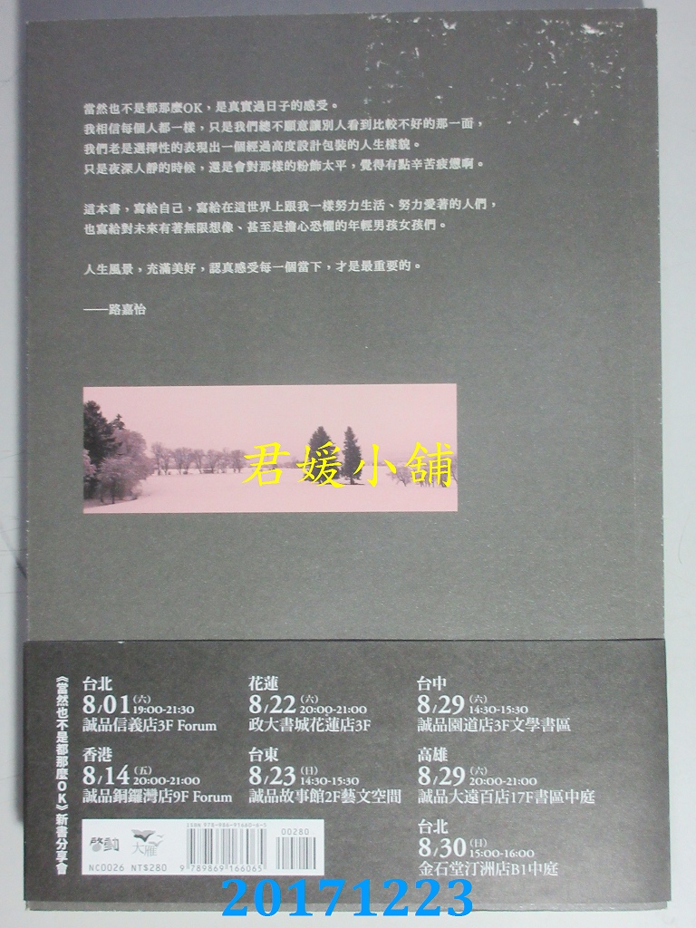 本店刊登的圖片都是第一時間出版日當天所拍,讀者若要首刷書,請在出刊時就來購買!!日久或售完就無庫存,要請書商補書,書商沒有幫忙挑首刷書這樣的服務,都是按書名送來,故不保證有首刷!!除非商品標題有特別寫是首刷版,請不要以非首刷或與圖片不同,來退貨退款,恕不受理!!購買前請張大眼睛看清楚,或旺旺詢問客服,以避免日後糾紛!!謝謝!! 【內容簡介】 當然也不是都那麼OK作者: 路嘉怡出版社:啟動文化出版日期:2015/07/27語言:繁體中文 書重 320 公克