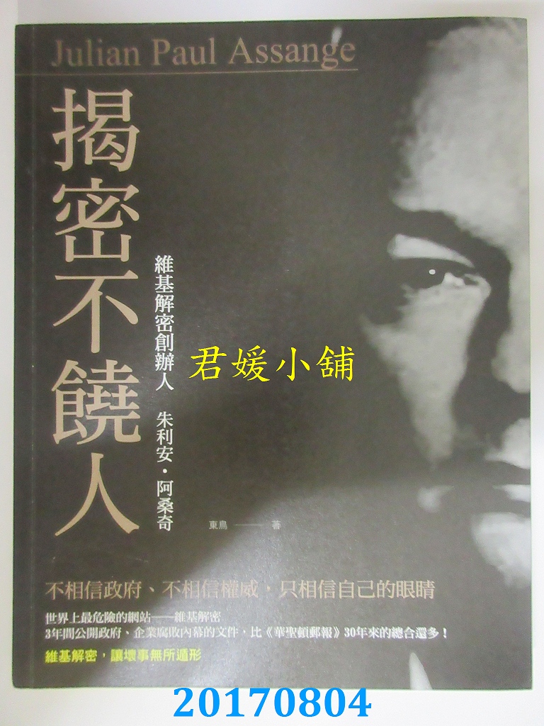 本店刊登的圖片都是第一時間出版日當天所拍,讀者若要首刷書,請在出刊時就來購買!!日久或售完就無庫存,要請書商補書,書商沒有幫忙挑首刷書這樣的服務,都是按書名送來,故不保證有首刷!!除非商品標題有特別寫是首刷版,請不要以非首刷或與圖片不同,來退貨退款,恕不受理!!購買前請張大眼睛看清楚,或旺旺詢問客服,以避免日後糾紛!!謝謝!! 【內容簡介】 揭密不饒人:維基解密創辦人朱利安‧阿桑奇作者: 東鳥出版社:有意思出版日期:2017/04/25語言:繁體中文 書重 430 公克