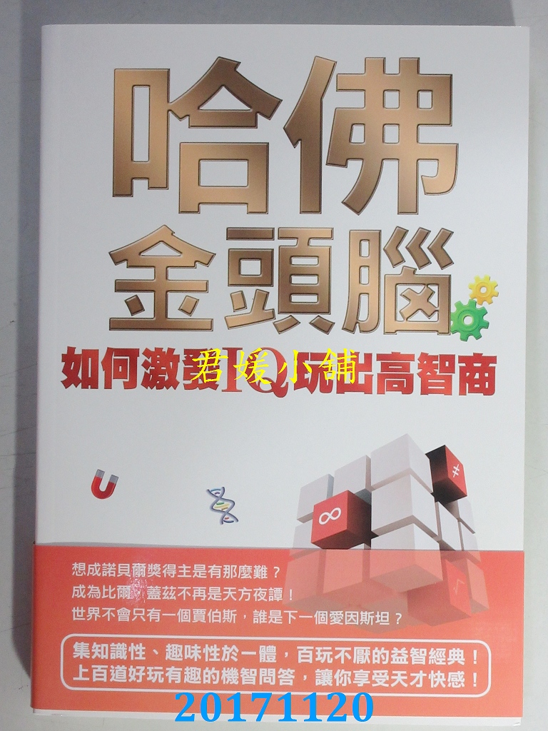 本店刊登的圖片都是第一時間出版日當天所拍,讀者若要首刷書,請在出刊時就來購買!!日久或售完就無庫存,要請書商補書,書商沒有幫忙挑首刷書這樣的服務,都是按書名送來,故不保證有首刷!!除非商品標題有特別寫是首刷版,請不要以非首刷或與圖片不同,來退貨退款,恕不受理!!購買前請張大眼睛看清楚,或旺旺詢問客服,以避免日後糾紛!!謝謝!! 【內容簡介】 哈佛金頭腦:如何激發IQ玩出高智商作者: 談旭出版社:風雲時代出版日期:2017/11/20語言:繁體中文 書重 400 公克