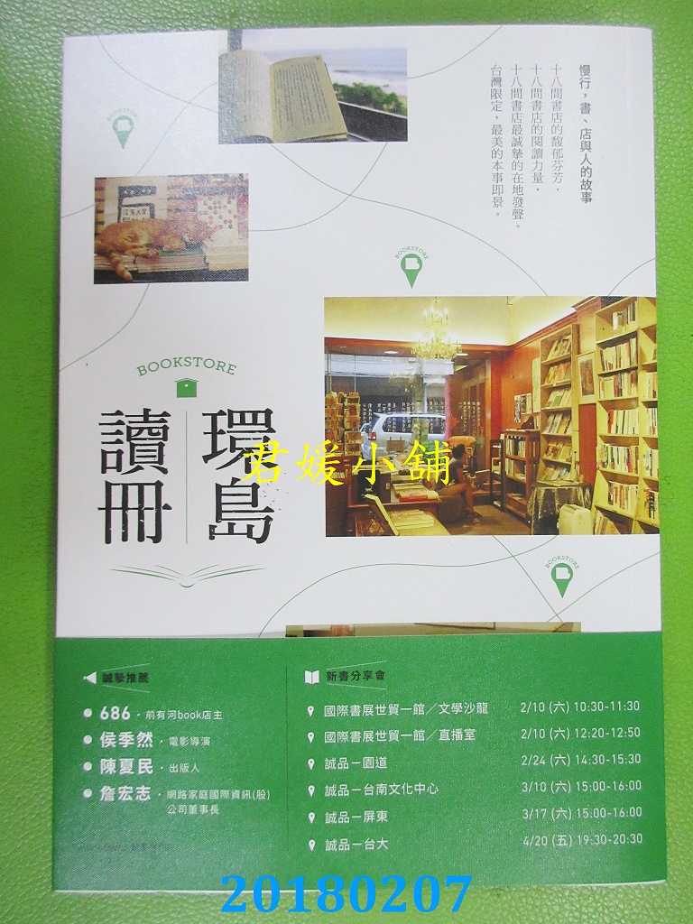 本店刊登的圖片都是第一時間出版日當天所拍,讀者若要首刷書,請在出刊時就來購買!!日久或售完就無庫存,要請書商補書,書商沒有幫忙挑首刷書這樣的服務,都是按書名送來,故不保證有首刷!!除非商品標題有特別寫是首刷版,請不要以非首刷或與圖片不同,來退貨退款,恕不受理!!購買前請張大眼睛看清楚,或旺旺詢問客服,以避免日後糾紛!!謝謝!! 【內容簡介】 環島讀冊:心中那間獨立書店,改變街區的閱讀力量 書重 450 公克