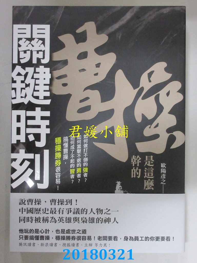 本店刊登的圖片都是第一時間出版日當天所拍,讀者若要首刷書,請在出刊時就來購買!!日久或售完就無庫存,要請書商補書,書商沒有幫忙挑首刷書這樣的服務,都是按書名送來,故不保證有首刷!!除非商品標題有特別寫是首刷版,請不要以非首刷或與圖片不同,來退貨退款,恕不受理!!購買前請張大眼睛看清楚,或旺旺詢問客服,以避免日後糾紛!!謝謝!! 【內容簡介】 關鍵時刻,曹操是這麼幹的 書重 410 公克