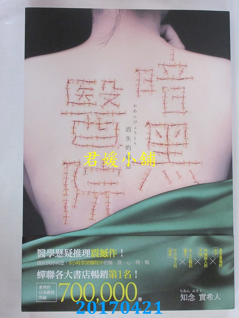 本店刊登的圖片都是第一時間出版日當天所拍,讀者若要首刷書,請在出刊時就來購買!!日久或售完就無庫存,要請書商補書,書商沒有幫忙挑首刷書這樣的服務,都是按書名送來,故不保證有首刷!!除非商品標題有特別寫是首刷版,請不要以非首刷或與圖片不同,來退貨退款,恕不受理!!購買前請張大眼睛看清楚,或旺旺詢問客服,以避免日後糾紛!!謝謝!! 【內容簡介】 暗黑醫院:消失的病患作者: 知念實希人 譯者:堤風出版社:尖端出版日期:2017/04/21語言:繁體中文