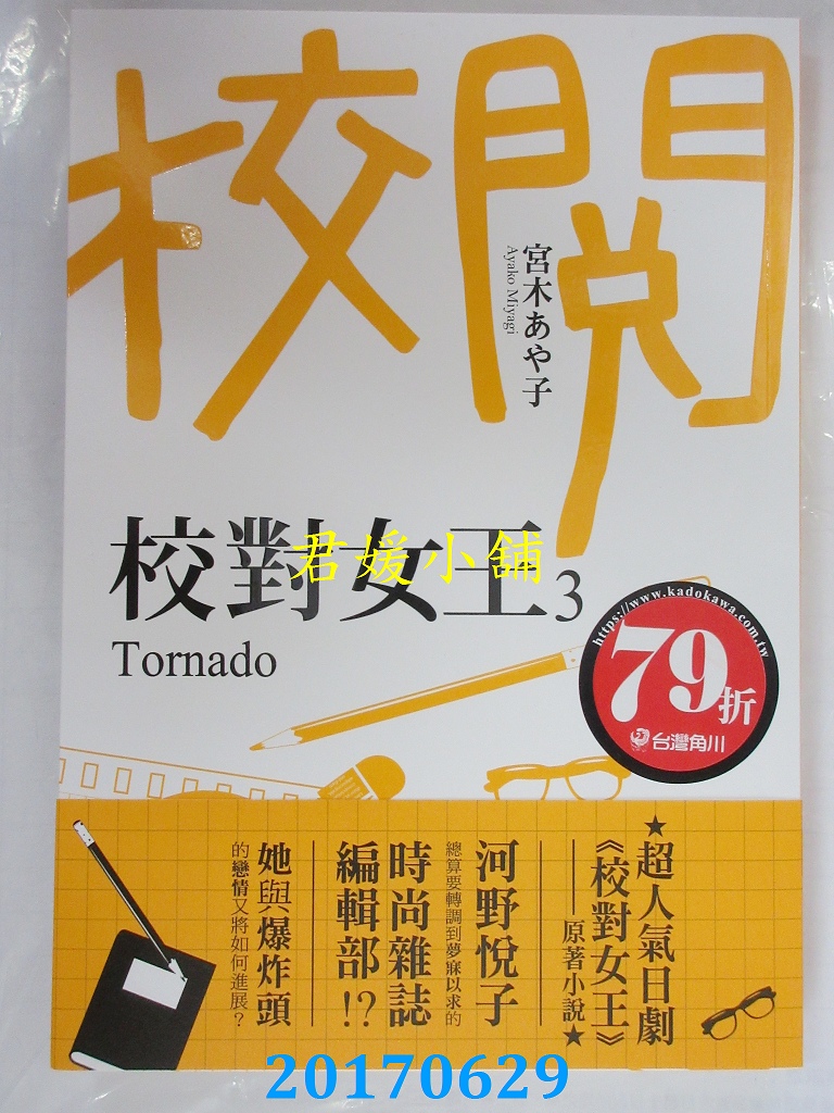 本店刊登的圖片都是第一時間出版日當天所拍,讀者若要首刷書,請在出刊時就來購買!!日久或售完就無庫存,要請書商補書,書商沒有幫忙挑首刷書這樣的服務,都是按書名送來,故不保證有首刷!!除非商品標題有特別寫是首刷版,請不要以非首刷或與圖片不同,來退貨退款,恕不受理!!購買前請張大眼睛看清楚,或旺旺詢問客服,以避免日後糾紛!!謝謝!! 【內容簡介】 校對女王 3 Tornado作者: 宮木あや子譯者:韓宛庭出版社:台灣角川出版日期:2017/06/29語言:繁體中文