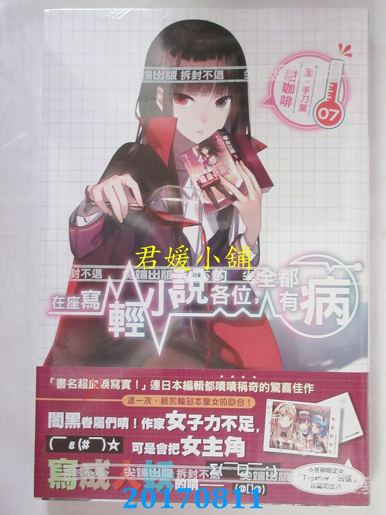 本店刊登的圖片都是第一時間出版日當天所拍,讀者若要首刷書,請在出刊時就來購買!!日久或售完就無庫存,要請書商補書,書商沒有幫忙挑首刷書這樣的服務,都是按書名送來,故不保證有首刷!!除非商品標題有特別寫是首刷版,請不要以非首刷或與圖片不同,來退貨退款,恕不受理!!購買前請張大眼睛看清楚,或旺旺詢問客服,以避免日後糾紛!!謝謝!! 【內容簡介】 在座寫輕小說的各位,全都有病(07)作者: 甜咖啡繪者:手刀葉出版社:尖端出版日期:2017/08/11語言:繁體中文 書重 300 公克