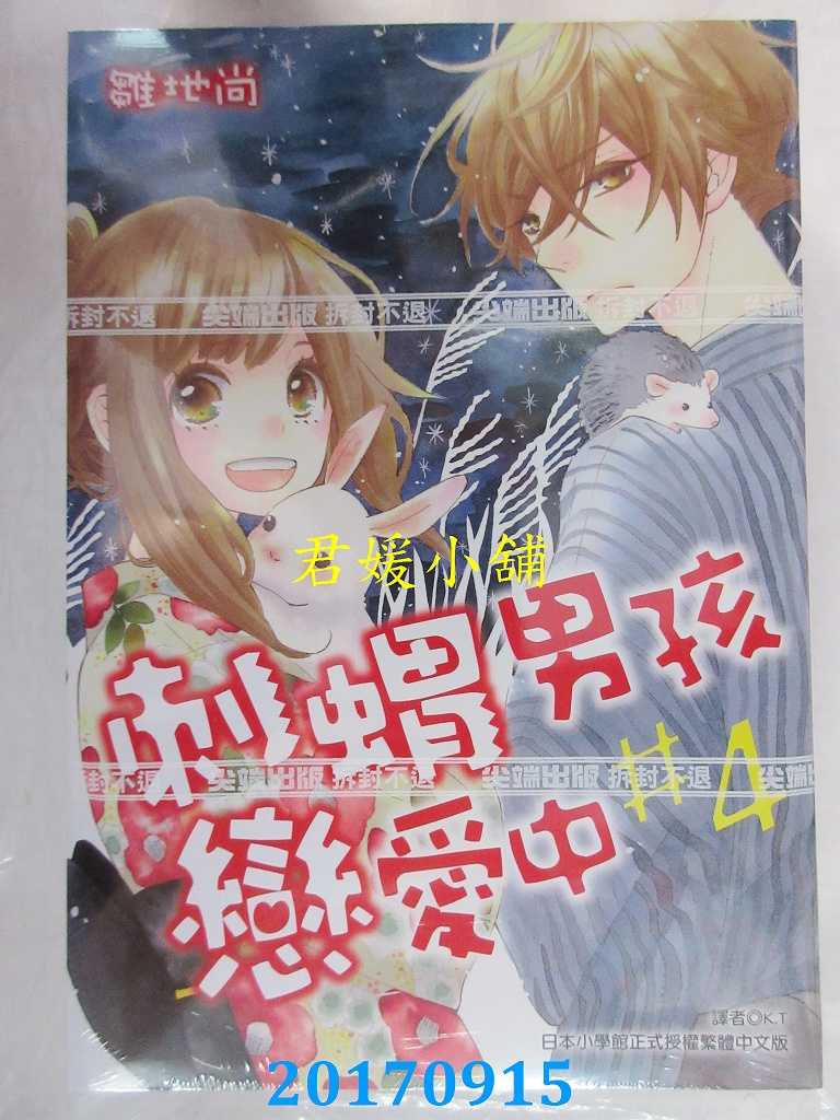 本店刊登的圖片都是第一時間出版日當天所拍,讀者若要首刷書,請在出刊時就來購買!!日久或售完就無庫存,要請書商補書,書商沒有幫忙挑首刷書這樣的服務,都是按書名送來,故不保證有首刷!!除非商品標題有特別寫是首刷版,請不要以非首刷或與圖片不同,來退貨退款,恕不受理!!購買前請張大眼睛看清楚,或旺旺詢問客服,以避免日後糾紛!!謝謝!! 【內容簡介】 刺蝟男孩戀愛中(04)作者: 雛地尚譯者:K.T出版社:尖端 出版日期:2017/09/15語言:繁體中文 書重 190 公克