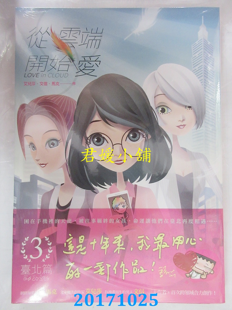 本店刊登的圖片都是第一時間出版日當天所拍,讀者若要首刷書,請在出刊時就來購買!!日久或售完就無庫存,要請書商補書,書商沒有幫忙挑首刷書這樣的服務,都是按書名送來,故不保證有首刷!!除非商品標題有特別寫是首刷版,請不要以非首刷或與圖片不同,來退貨退款,恕不受理!!購買前請張大眼睛看清楚,或旺旺詢問客服,以避免日後糾紛!!謝謝!! 【內容簡介】 從雲端開始愛 第三集:臺北篇作者: 艾兒莎, 文信, 馬克 出版社:原動力文化 出版日期:2017/10/25語言:繁體中文