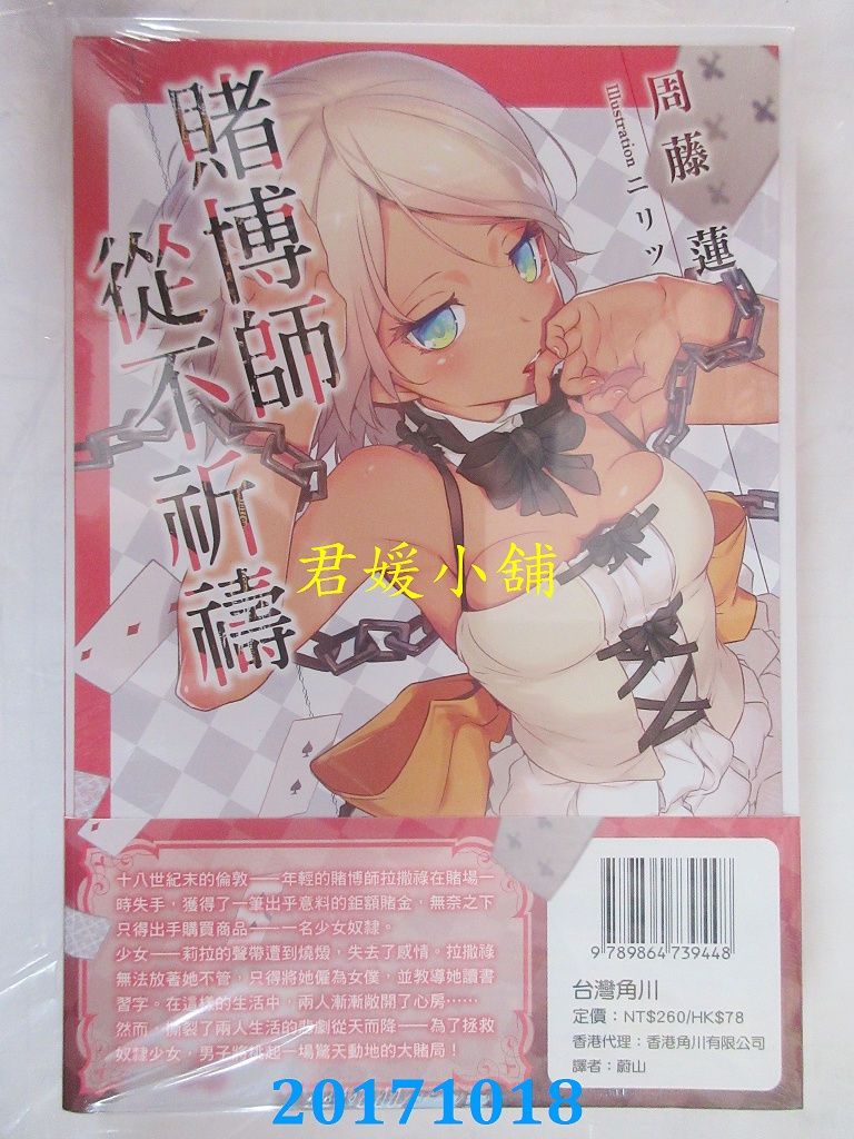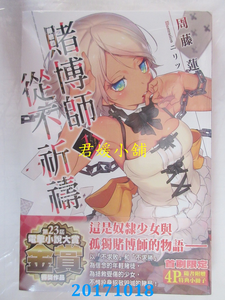 本店刊登的圖片都是第一時間出版日當天所拍,讀者若要首刷書,請在出刊時就來購買!!日久或售完就無庫存,要請書商補書,書商沒有幫忙挑首刷書這樣的服務,都是按書名送來,故不保證有首刷!!除非商品標題有特別寫是首刷版,請不要以非首刷或與圖片不同,來退貨退款,恕不受理!!購買前請張大眼睛看清楚,或旺旺詢問客服,以避免日後糾紛!!謝謝!! 【內容簡介】 賭博師從不祈禱 (1)作者: 周藤蓮譯者: 蔚山出版社:台灣角川出版日期:2017/10/18語言:繁體中文 書重 360 公克