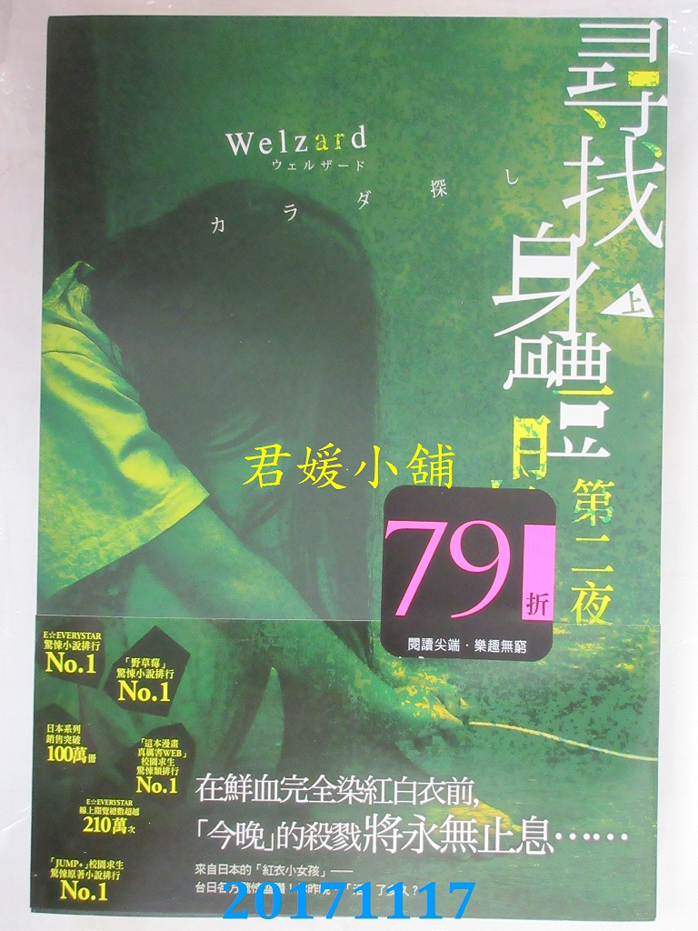 本店刊登的圖片都是第一時間出版日當天所拍,讀者若要首刷書,請在出刊時就來購買!!日久或售完就無庫存,要請書商補書,書商沒有幫忙挑首刷書這樣的服務,都是按書名送來,故不保證有首刷!!除非商品標題有特別寫是首刷版,請不要以非首刷或與圖片不同,來退貨退款,恕不受理!!購買前請張大眼睛看清楚,或旺旺詢問客服,以避免日後糾紛!!謝謝!! 【內容簡介】 尋找身體 第二夜 (上) 作者: Welzard 譯者: 王美娟出版社:尖端出版日期:2017/11/17語言:繁體中文