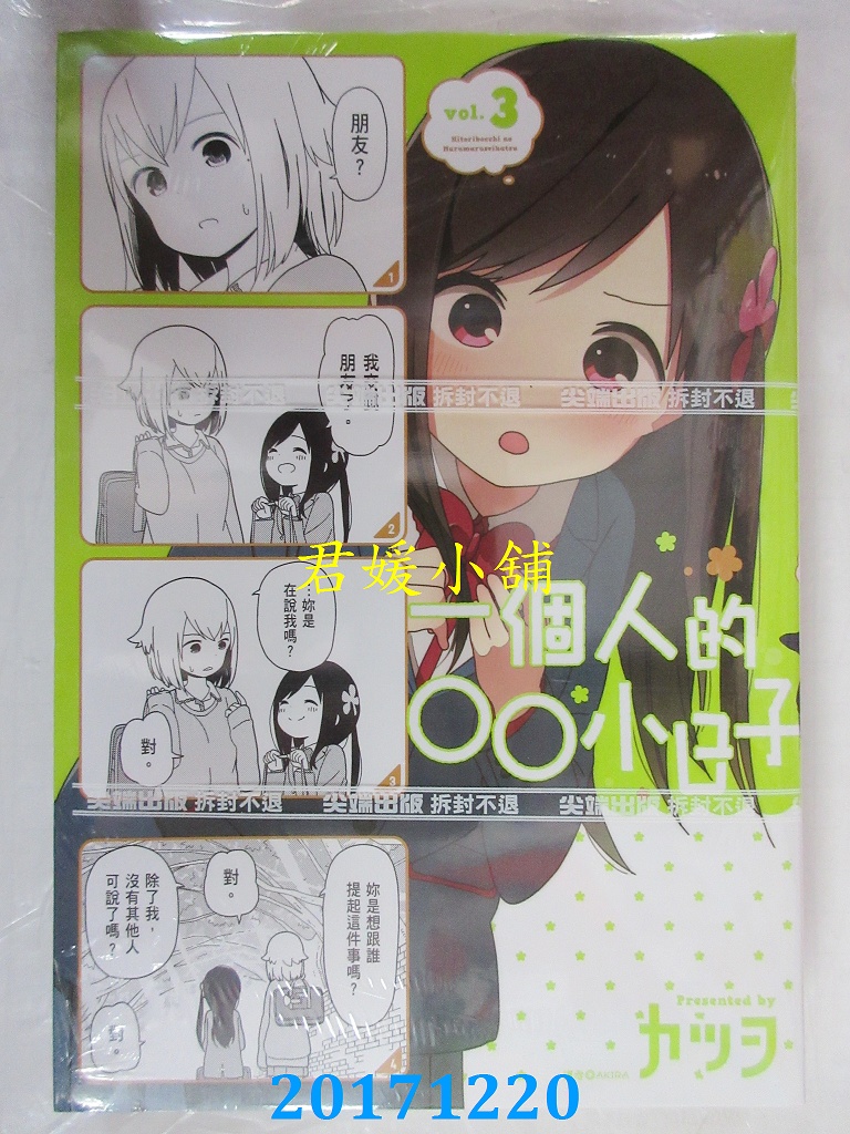 本店刊登的圖片都是第一時間出版日當天所拍,讀者若要首刷書,請在出刊時就來購買!!日久或售完就無庫存,要請書商補書,書商沒有幫忙挑首刷書這樣的服務,都是按書名送來,故不保證有首刷!!除非商品標題有特別寫是首刷版,請不要以非首刷或與圖片不同,來退貨退款,恕不受理!!購買前請張大眼睛看清楚,或旺旺詢問客服,以避免日後糾紛!!謝謝!! 【內容簡介】 一個人的○○小日子(3)作者: カツヲ譯者: AKIRA出版社:尖端出版日期:2017/12/20語言:繁體中文 書重 240 公克