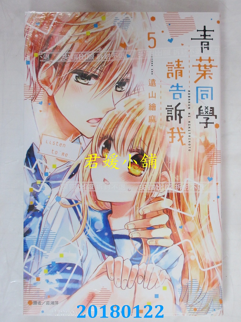 本店刊登的圖片都是第一時間出版日當天所拍,讀者若要首刷書,請在出刊時就來購買!!日久或售完就無庫存,要請書商補書,書商沒有幫忙挑首刷書這樣的服務,都是按書名送來,故不保證有首刷!!除非商品標題有特別寫是首刷版,請不要以非首刷或與圖片不同,來退貨退款,恕不受理!!購買前請張大眼睛看清楚,或旺旺詢問客服,以避免日後糾紛!!謝謝!! 【內容簡介】 青葉同學請告訴我(05)作者: 遠山繪麻 譯者: 莊湘萍出版社:尖端出版日期:2018/01/22語言:繁體中文