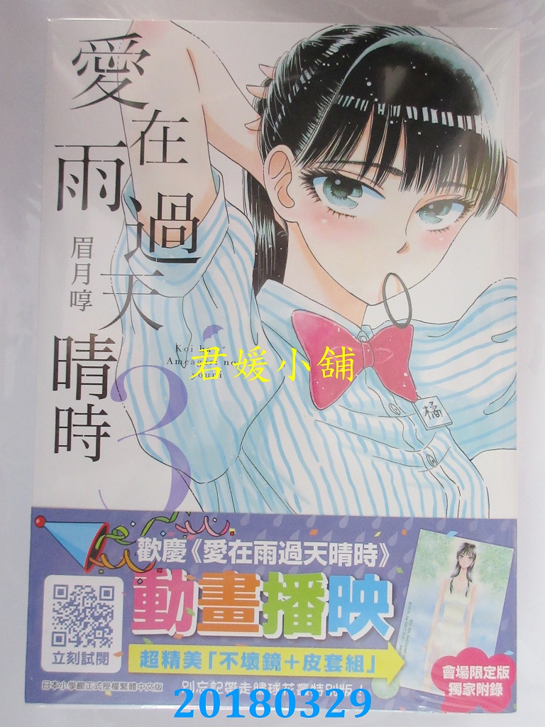 本店刊登的圖片都是第一時間出版日當天所拍,讀者若要首刷書,請在出刊時就來購買!!日久或售完就無庫存,要請書商補書,書商沒有幫忙挑首刷書這樣的服務,都是按書名送來,故不保證有首刷!!除非商品標題有特別寫是首刷版,請不要以非首刷或與圖片不同,來退貨退款,恕不受理!!購買前請張大眼睛看清楚,或旺旺詢問客服,以避免日後糾紛!!謝謝!! 【內容簡介】 愛在雨過天晴時(03)會場限定版 書重 230 公克